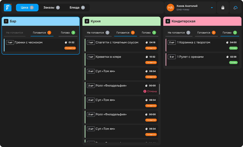 Кухонный экран для повара на планшете или ПК, где в режиме реального времени отображаются все заказы. Повара видят полный состав блюда, модификаторы, пожелания гостей и метки приоритета от официантов. На основе этой информации повар сам принимает решение, что готовить в первую очередь — учитывая загрузку, время приготовления и срочность заказов. Заказы приходят напрямую из терминала и кассы — никаких бумажных чеков и ручной передачи информации. Повара отмечают готовность блюд одним нажатием, и статус мгновенно обновляется в терминале кассира и на экране сборки. Всё четко, быстро и без ошибок — кухня работает слаженно и эффективно.