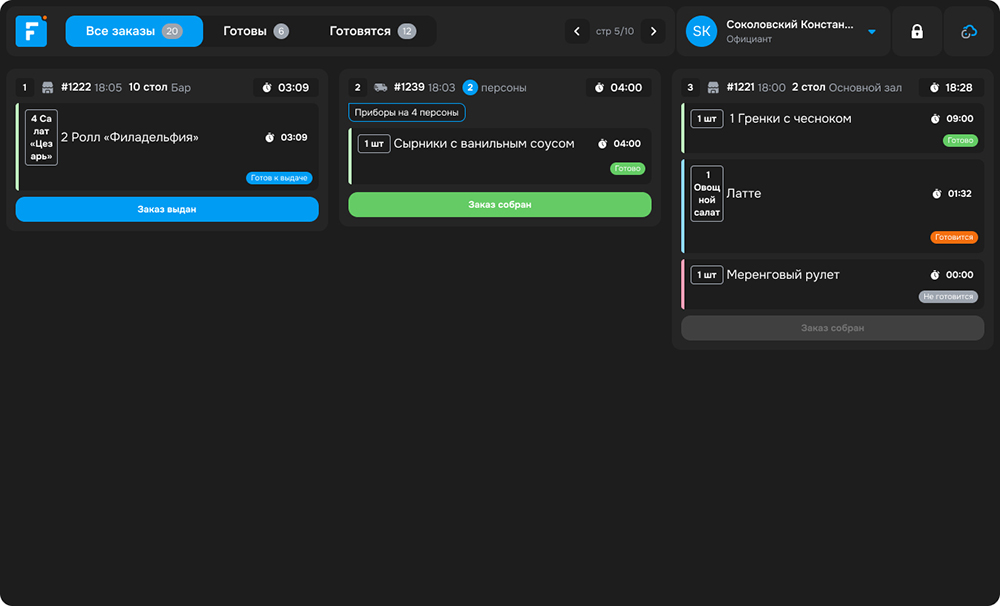 Программа для сборки и выдачи заказов с четким контролем каждого этапа на планшете или ПК. Кассир создает заказ, повар отмечает готовность каждого блюда на экране кухни, а сборщик видит полный список позиций с модификаторами и комментариями — остается только скомплектовать и выдать гостю. Каждый участник процесса видит актуальный статус заказа в режиме реального времени. Система исключает ошибки при сборке, ускоряет выдачу заказов и помогает контролировать качество — гость получает ровно то, что заказал, в правильной комплектации и вовремя.