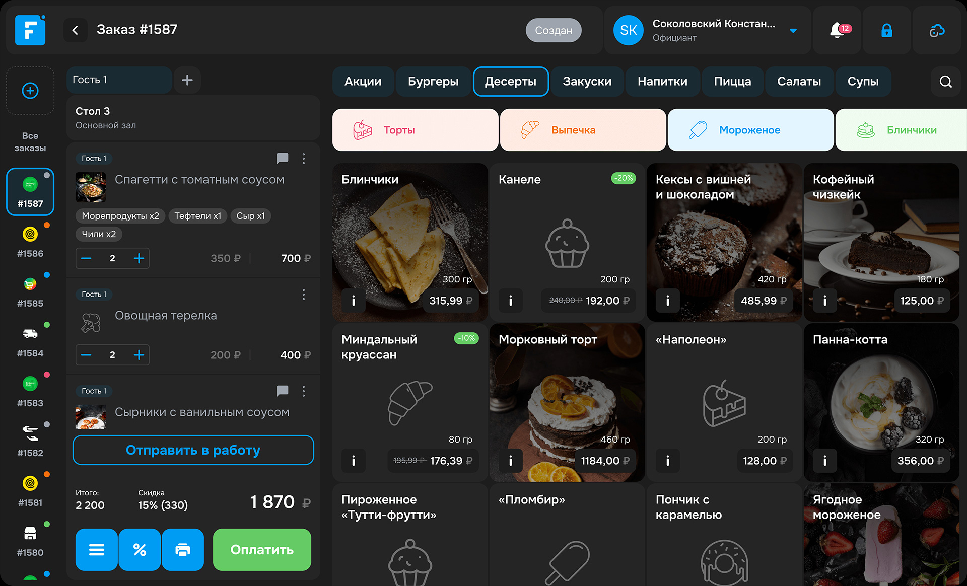 Мобильное приложение для официантов на iOS и Android. Превращает телефон официанта в полноценную кассу — принимайте заказы прямо у столика гостя, не отходя к стационарной кассе. Добавляйте блюда, настраивайте модификаторы по пожеланиям гостя, указывайте комментарии для кухни и отправляйте заказ на терминал одним нажатием. Заказ автоматически попадает на экран повара или печатается заказкой (бегунком) на термопринтер, если экран кухни не подключен. Разделяйте счет между гостями, применяйте скидки и бонусы по картам лояльности. Официант видит все свои столы, открытые заказы и статусы готовности блюд в режиме реального времени. Быстрое обслуживание, меньше ошибок, больше довольных гостей — всё в кармане у официанта.