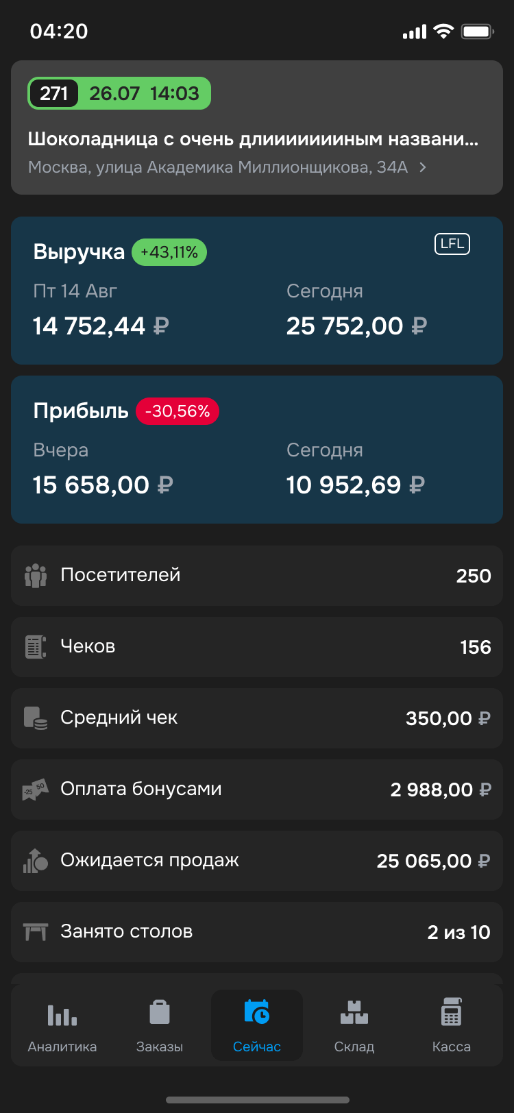 Мобильное приложение для владельца и управляющего на iOS и Android. Следите за бизнесом из любой точки мира в режиме реального времени — открывайте приложение и видите всю ключевую информацию. Онлайн-выручка по каждой точке и всей сети, количество и сумма заказов, остатки на складе, кассовые операции, работа персонала — вся аналитика в одном приложении. Получайте push-уведомления о важных событиях: крупные заказы, критические остатки товара, открытие и закрытие смен. Смотрите отчеты, графики и динамику продаж — принимайте управленческие решения на основе актуальных данных, где бы вы ни находились.