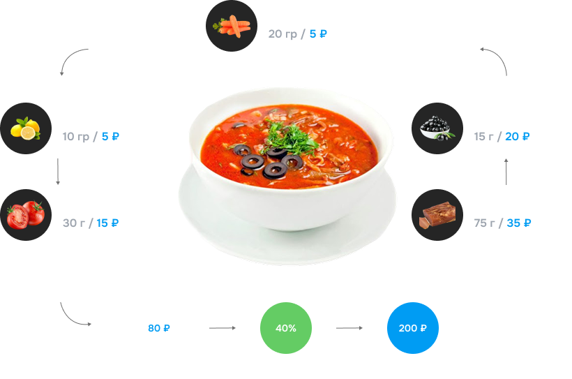• Можно учитывать каждое приготовленное блюдо, причем, не только порционно, но и с подсчетом граммовок, чтобы продавать на развес.